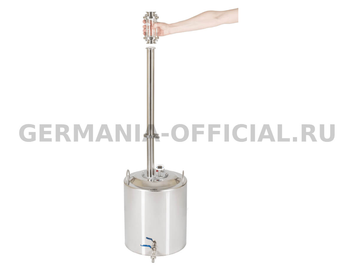 Спиртовой пар, без примесей и сивухи, попадает в вертикальный холодильник (7). ВАЖНО: подключайте холодильник правильно: xолодная вода должна заходить в нижний штуцер — так вы добьётесь максимального КПД охлаждения. С аппаратом Германия вы получите абсолютно чистый и холодный напиток на выходе, причём без потерь и лишних усилий.